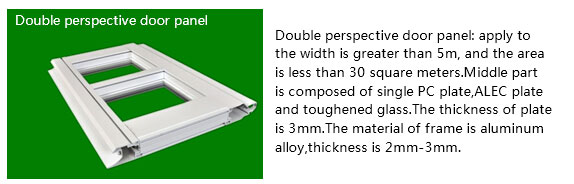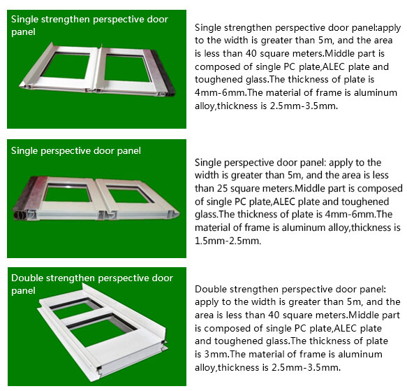 Commercial perspective door/industry perspective door:This is the introduction of foreign advanced technology, combined with many years of practice and the development of a new generation products.This product is widely used in the automobile 4S shop, the equipment exhibition hall, the fire door, the shopping malls and other occasions. The door body has a combination of aluminum alloy and polycarbonate glass, you can also use acrylic plate, or tempered glass.With a higher transmittance, make the architectural appearance more beautiful. Can provide personalized design: high transmittance is more conducive to the improvement of working environment.